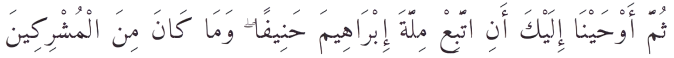 "Kemudian Kami wahyukan kepadamu (Muhammad), 'Ikutilah agama Ibrahim yang lurus dalam keimanan, dan bukanlah dia termasuk orang-orang yang mempersekutukan Allah”
